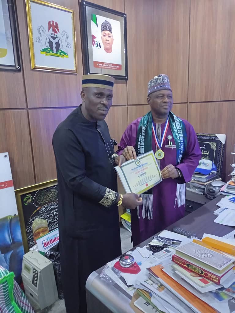 The Director General Protocol, Kogi State Government House, Alhaji Suleiman Ibrahim PhD has been conferred with an award of Ambassador of Ethics and Conscience by an Anti Corruption Non Governmental Organization, Centre for Ethics and Self Value Orientation.